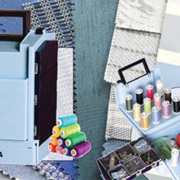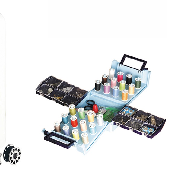 - Accessories include: three bobbins, needles and a threader