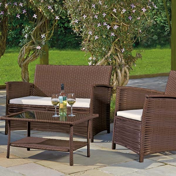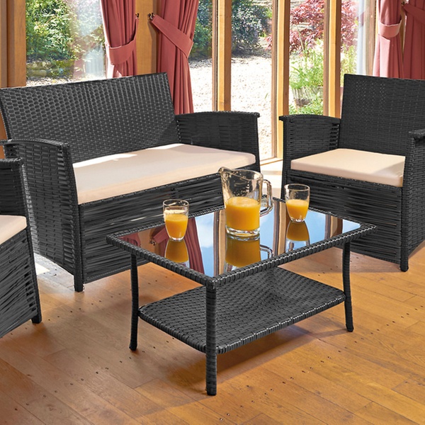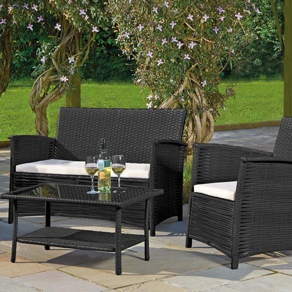Made from weather-resistant PVC for all-year-round outdoor keeping, this set includes two armchairs, a two-seater sofa and a coffee table